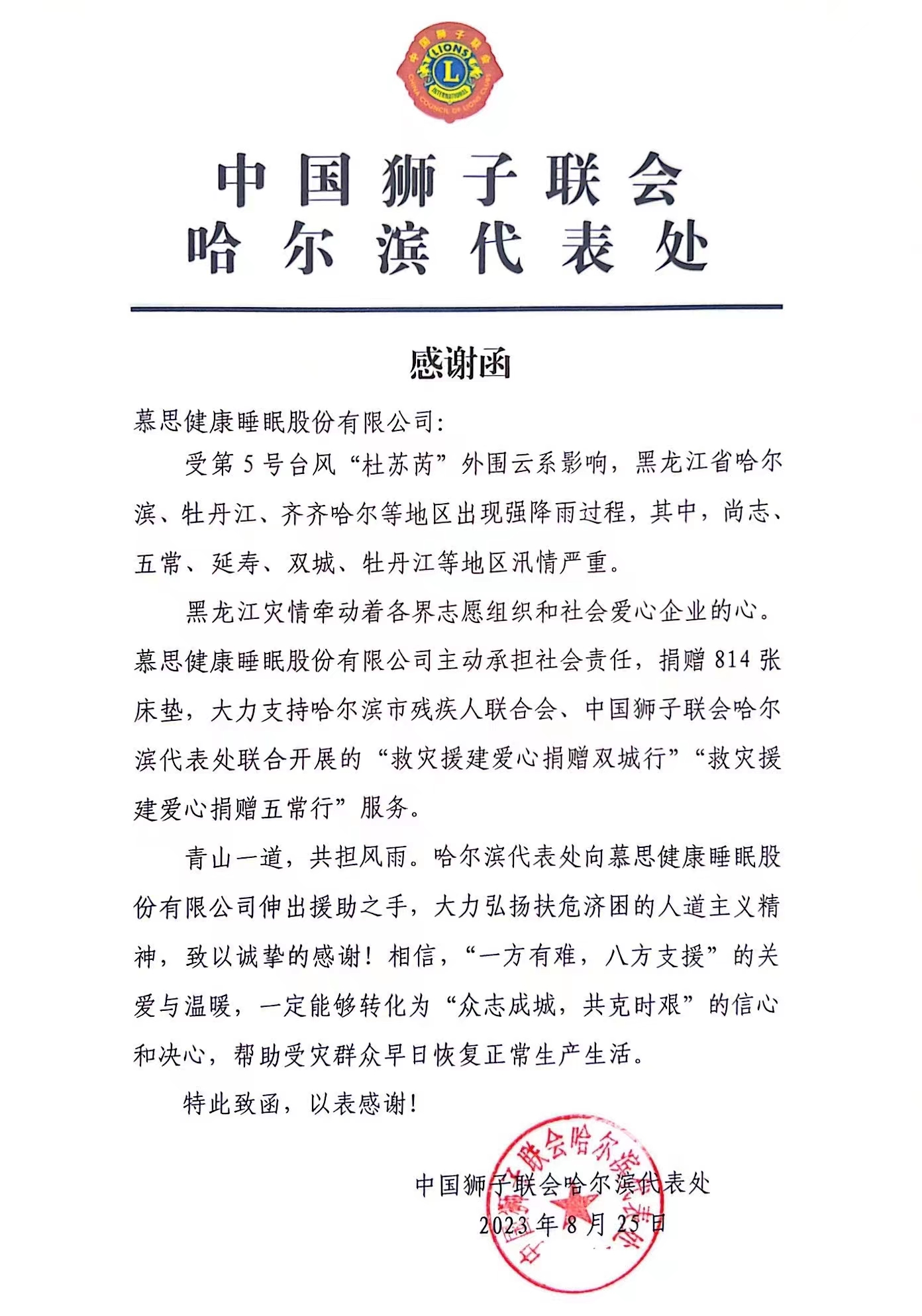 5號臺風“杜蘇芮”席卷東北期間,黑龍江多處災情告急,五常地區(qū)尤為嚴重。在AG旗艦廳蒙龍商會牽頭下,AG旗艦廳集團聯(lián)合哈爾濱市殘疾人聯(lián)合會、中國獅子聯(lián)會哈爾濱代表處開展了“救災援建愛心捐贈雙城行”“救災援建愛心捐贈五常行”活動,向災區(qū)共計捐贈了814張床墊,為安置災區(qū)群眾做出了重要貢獻。